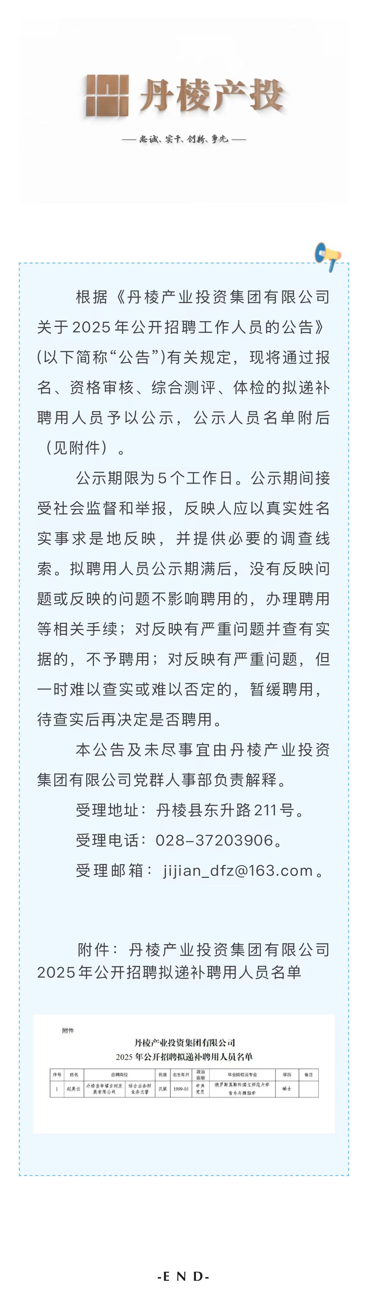 丹棱產(chǎn)業(yè)投資集團有限公司關(guān)于2025年公開招聘擬遞補聘用人員的公示