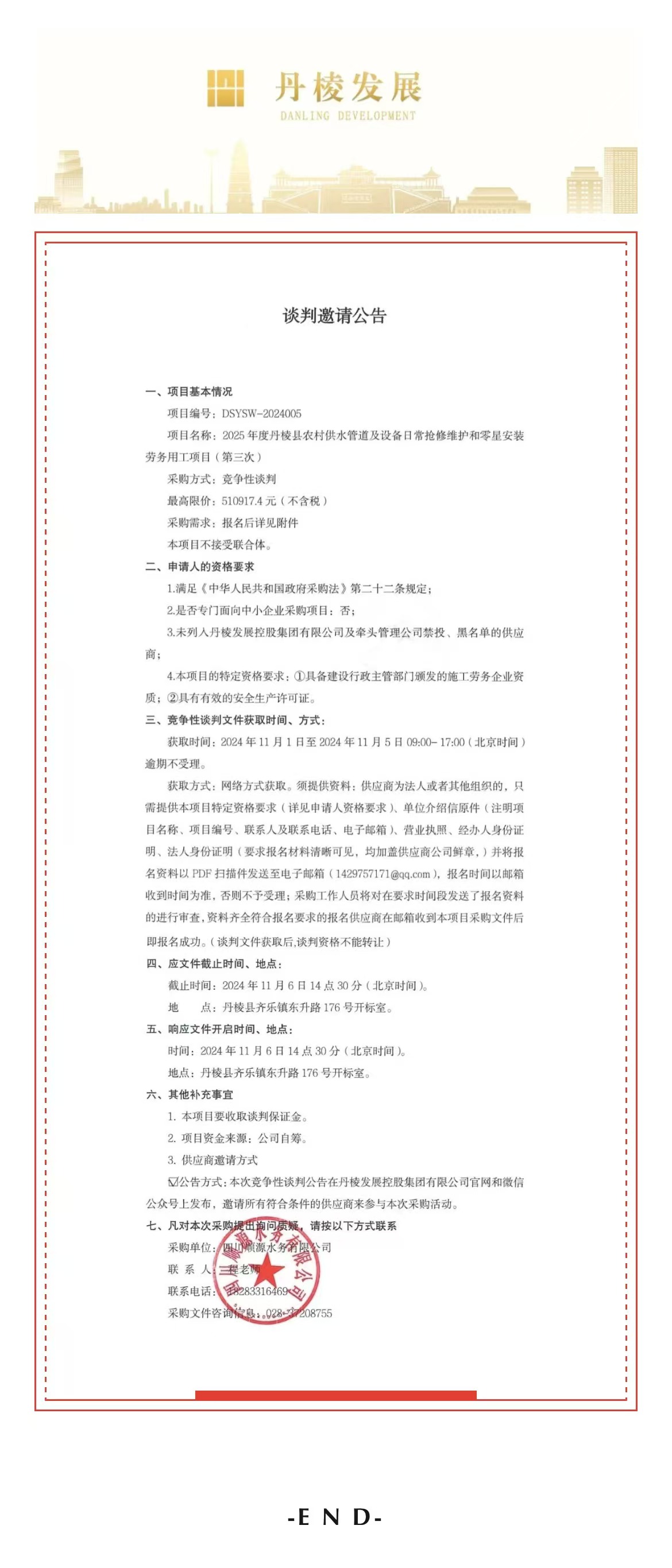 2025年度丹棱縣農村供水管道及設備日常搶修維護和零星安裝勞務用工項目(第三次)談判邀請公告