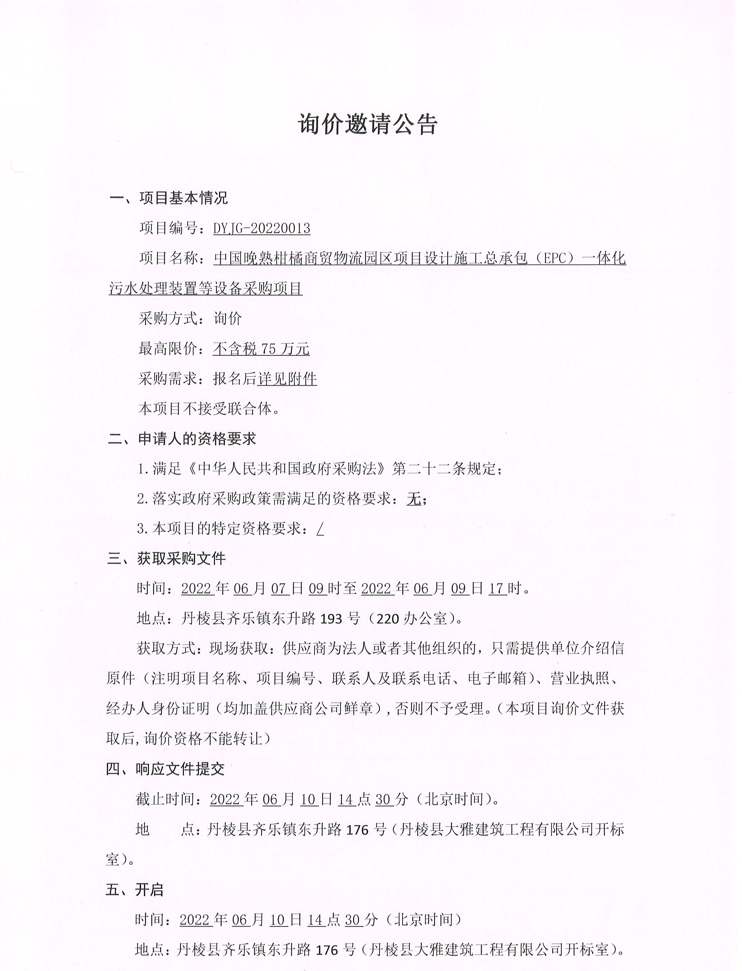 中國晚熟柑橘商貿(mào)物流園區(qū)項目設計施工總承包(EPC) 體化污水處理裝置等設備采購項目詢價邀請公告