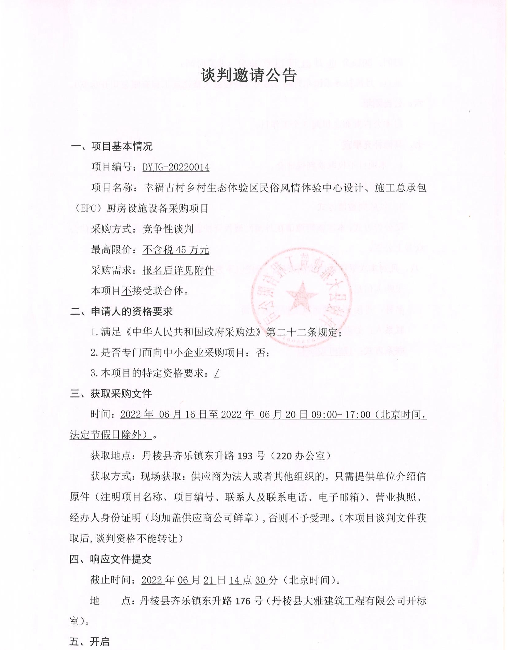 幸福古村鄉(xiāng)村生態(tài)體驗區(qū)民俗風(fēng)情體驗中心設(shè)計、施工總承包(EPC)廚房設(shè)施設(shè)備采購項目談判邀請公告