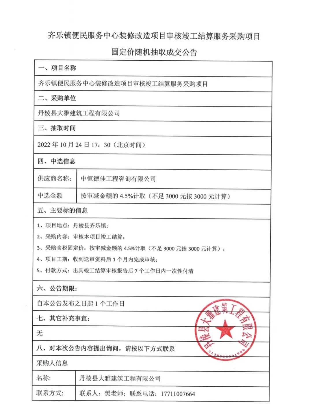齊樂(lè)鎮(zhèn)便民服務(wù)中心裝修改造項(xiàng)目審核竣工結(jié)算服務(wù)采購(gòu)項(xiàng)目固定價(jià)隨機(jī)抽取成交公告