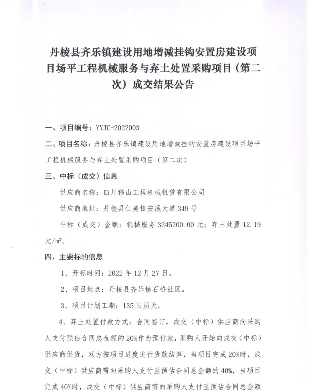 丹棱縣齊樂鎮(zhèn)建設用地增減掛鉤安置房建設項目場平工程機械服務與棄土處置采購項目(第二次)成交結(jié)果公告