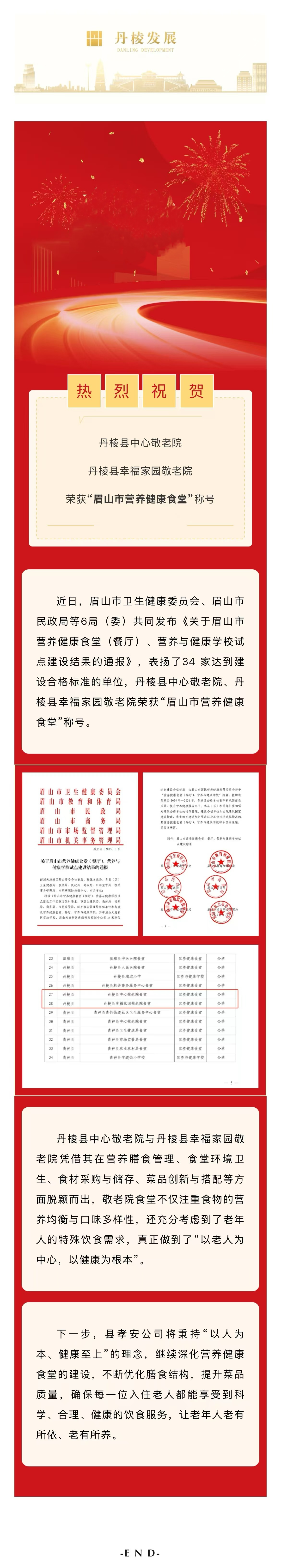 【縣孝安公司】喜報!丹棱縣中心敬老院、丹棱縣幸福家園敬老院榮獲“眉山市營養(yǎng)健康食堂”稱號