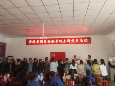 工作安排后,縣國資金融局黨組集體為5月入黨黨員過政治生日,縣國資金融局(縣金融服務中心)副主任茍永慶同志為“過生日”的黨員們送上精心制作的“黨員政治生日卡”,勉勵黨員同志要“常思入黨初衷、銘記入黨誓詞、牢記黨員義務”,發(fā)揮黨員先鋒模范作用,在今后的工作中不斷創(chuàng)先爭優(yōu),做好表率。活動最后,全體黨員同志在縣國資金融局黨組成員、副局長潘國榮同志的帶領下重溫入黨誓詞、面對黨旗莊嚴宣誓。